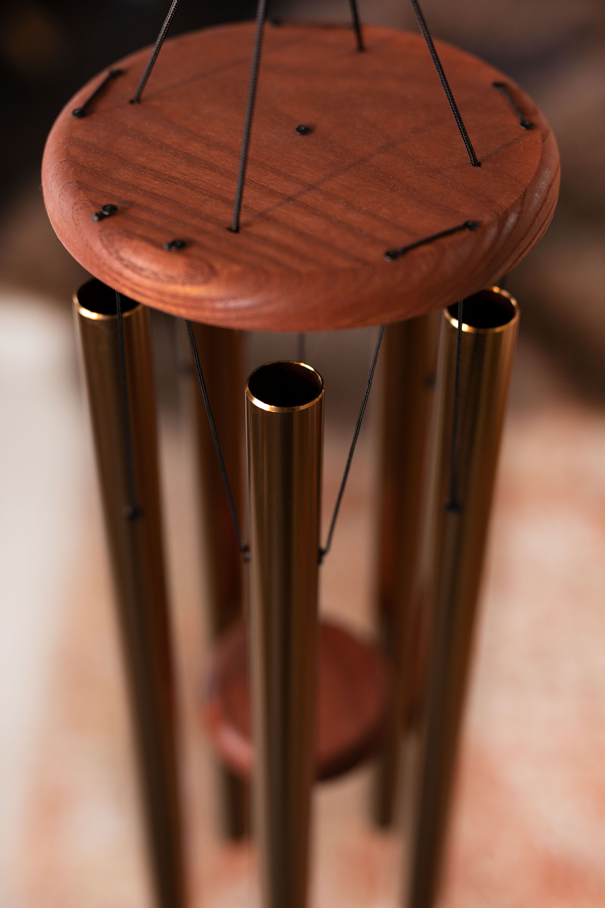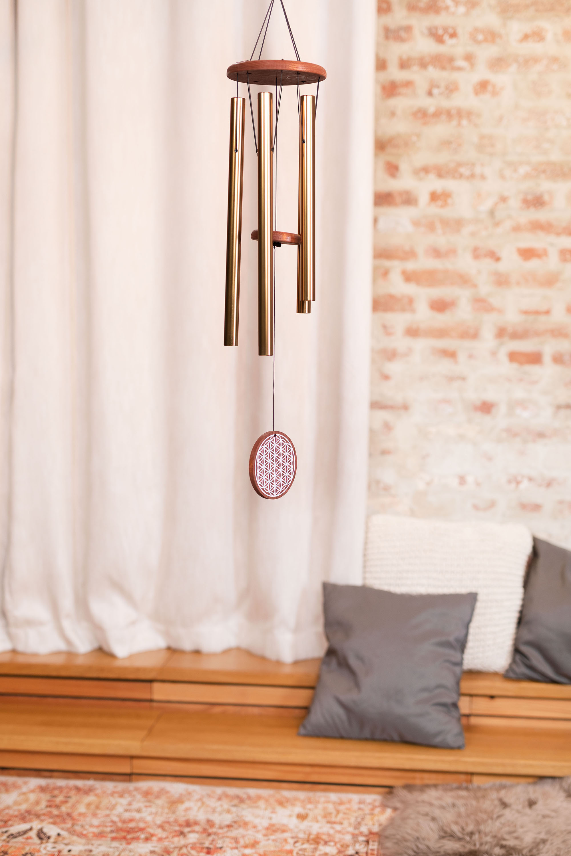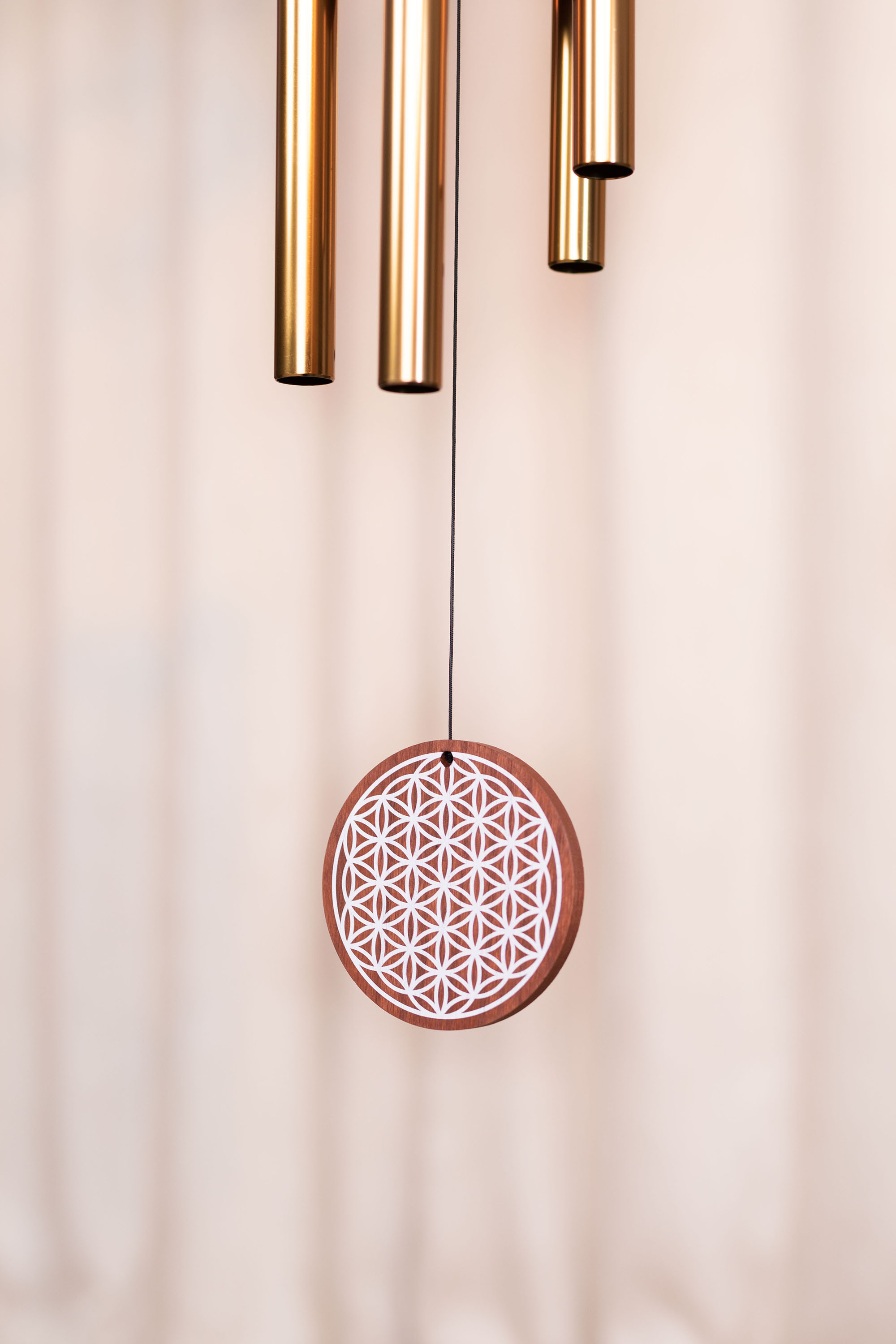 Diese Chimes zeichnen sich durch eine besonders gute Resonanz und einen langen Nachhall aus. Sie sind auf den Grundton A4/a' 432 Hz gestimmt. Genießen Sie den weichen und beruhigenden Klang. Ein dekoratives Symbol am unteren Ende der Schnur vervollständigt diese schönen Chimes.