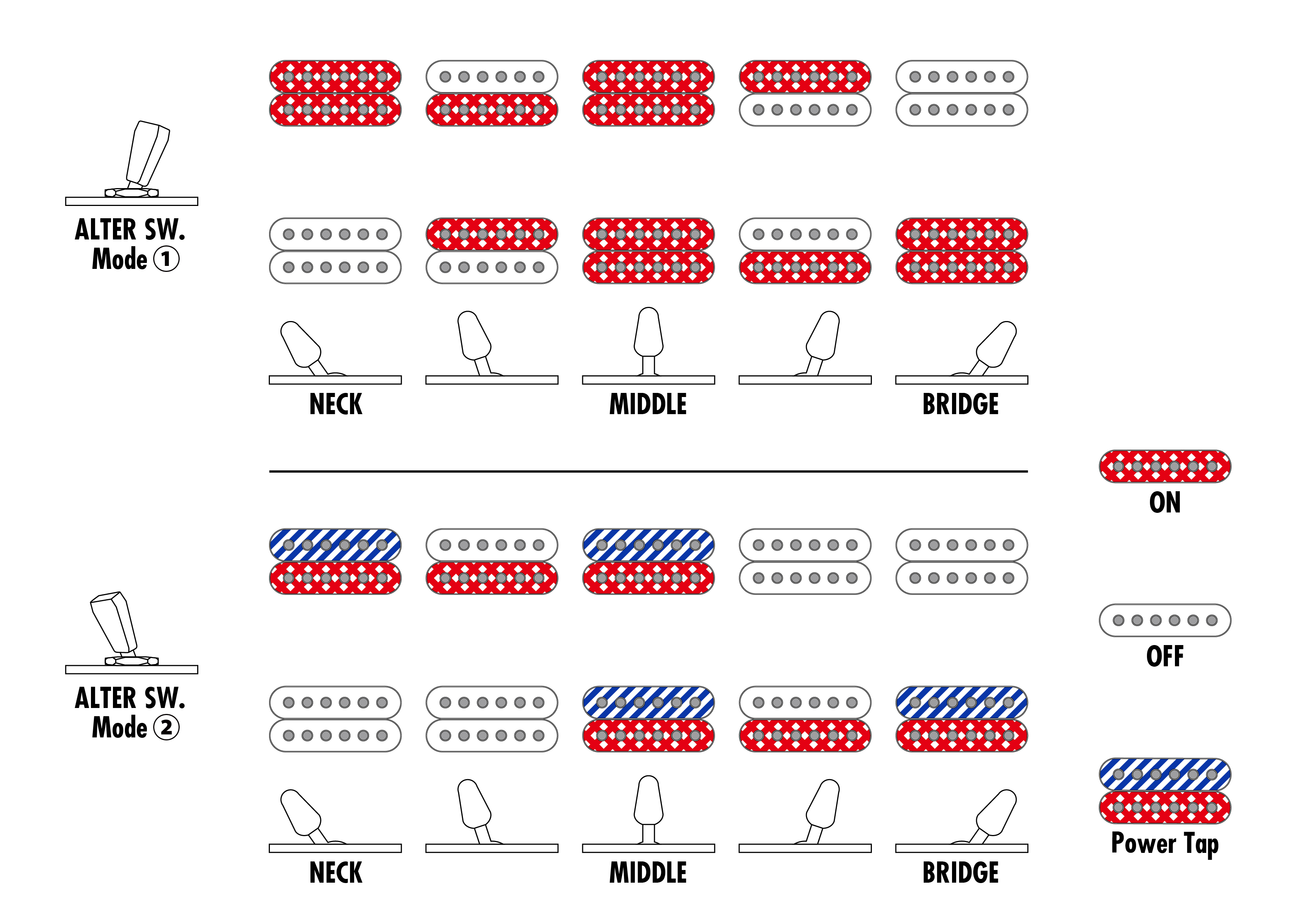 - Schaltung: dyna-MIX9 mit Alter Switch – 9 verschiedene Pickup-Kombinationen auf Knopfdruck